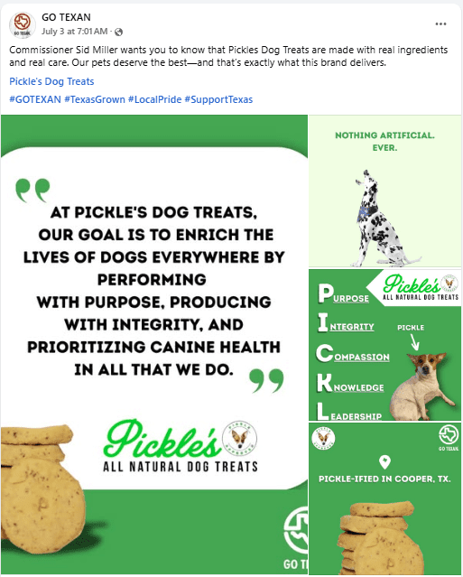 THANK YOU TO EVERYONE WITH #GOTEXAN AND THE TEXAS DEPARTMENT OF AGRICULTURE FOR ALL OF THE SUPPORT SHOWN TOWARDS PICKLE'S DOG TREATS! WE'RE THRILLED TO BE OFFICIAL GO TEXAN PARTNERS!